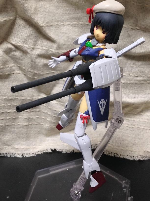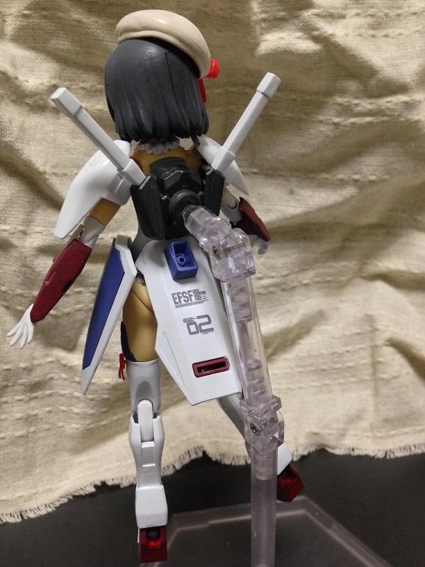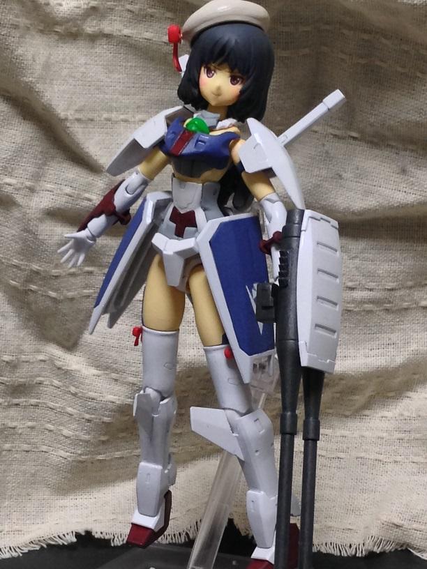 マテリアをベースにMS少女的なイメージでガンプラパーツを使って敢えてガンダムっぽさを強調してみたんですが、どうでしょうか。特にスカートアーマーとバックパックはガンダムMkⅡのシールド×2で作りました。帽子やリボンはPLUMのアクセサリー使用。
