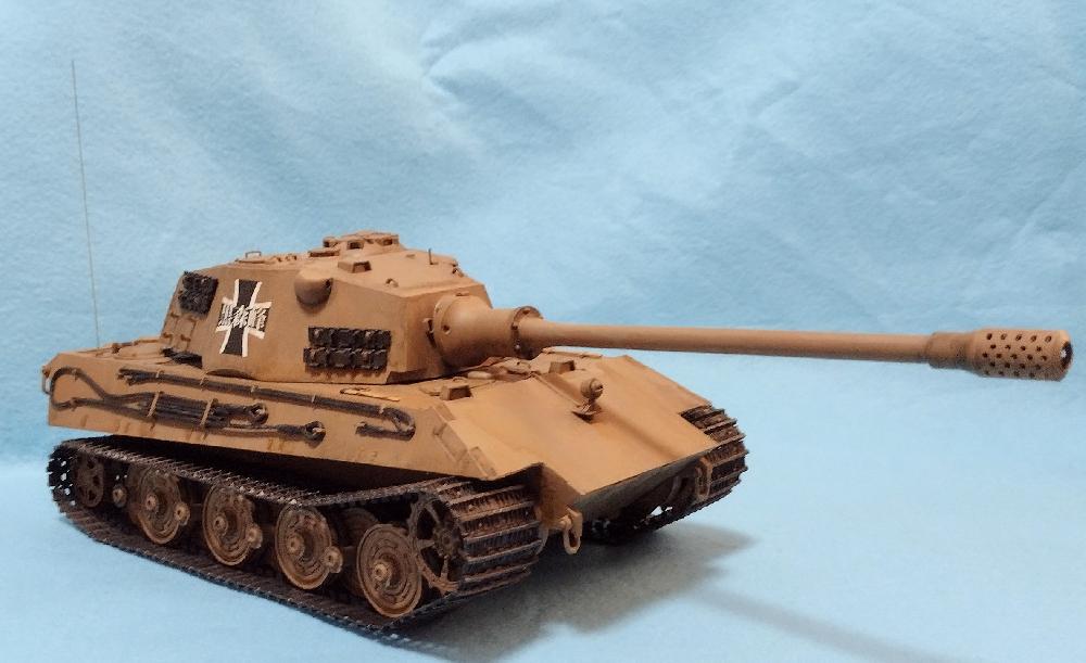 ロケットモデルズの1/35ティーガーIII(12.8㌢砲)です。ワゴンだったので安く買えました〜。モールドとかは可もなく不可もなくってところかな?なんとなくしまりがないような感じ?車外装備品なんかはペラペラな印象。まあ塗装したらそこまで気にはなりませんかね。転輪ユニットの説明書が間違ってたり(メーカーホムペに修正図あり)、パーツは車体上部が歪んでいてシャシーとの組み合わせは修正が必要だったり。あと、キットでは履帯が左右で向きが変わってしまいます…。今回はフェンダーレスで履帯を強調しました。