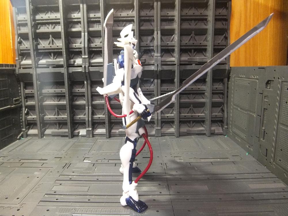 制作としては大したことはせず、足りない色を塗装した程度で、首と膝の動力パイプ・ソード部分の色分け・シャーペンで墨入れした程度です。