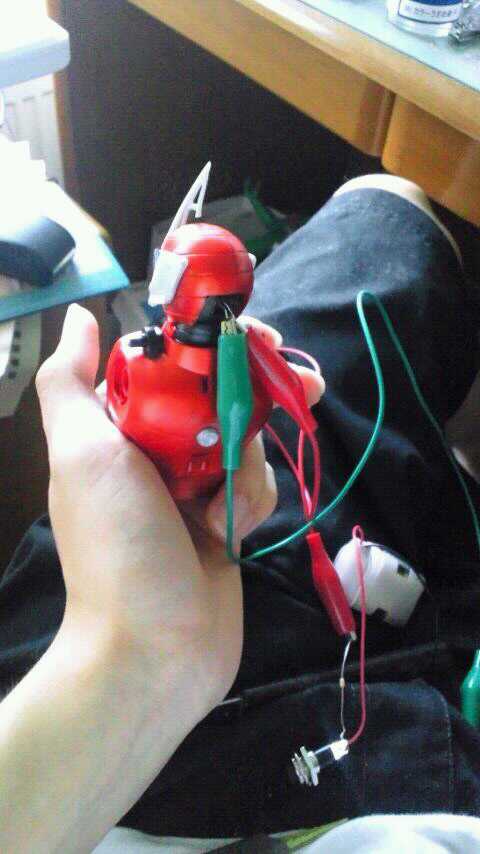 全体の赤を、シルバーを下地にクリアーレッドを重ねて、黒部分にはつや消しブラックを使いました。頭にはLEDを仕込んで、眼が光るようにしました。