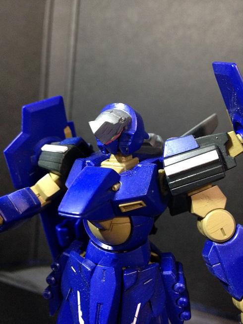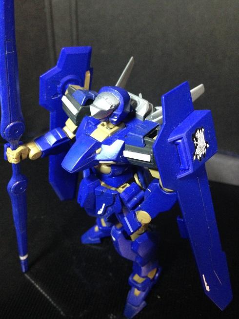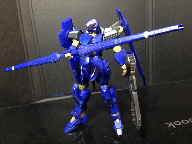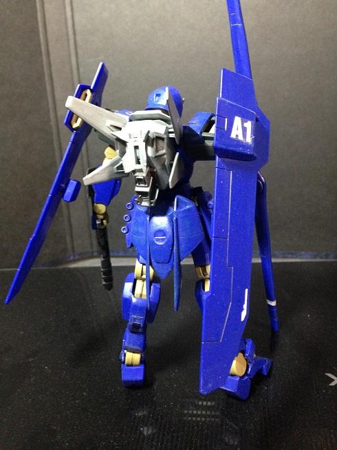 大きくは、太ももを細長いパーツに交換、つま先を延長して足を長めにしたのと、頭部のトサカ部分を少し斜め上向きにしてマスクを大きくしてちょっとガンダム顔にしたのと、バックパック及び腰部前後のアーマーがあっさりしすぎてる気がして、ジャンクパーツで作り直したものです。他、チョコチョコとディテールを追加したりしてます。