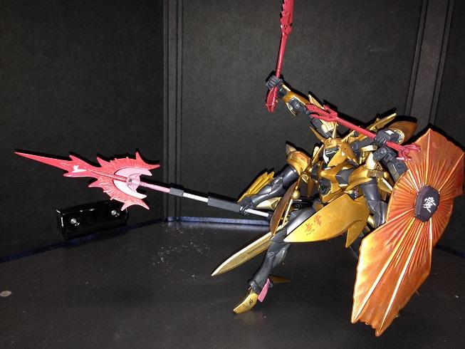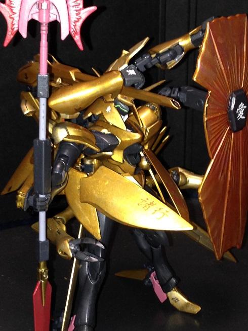 ヴェイガンの高潔な戦士をイメージしたもので、脳内設定では日本の伝統文化に憧れる外国人ビルダーがバトル用に作った機体で、和風テイスト、漢字マーキングが施してあります。金色の機体色は対ビームコーティング仕様との噂もありますw