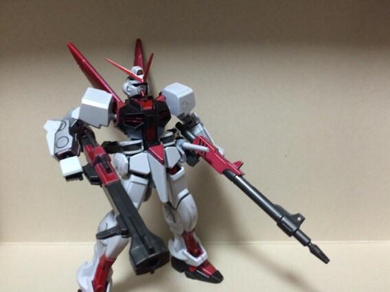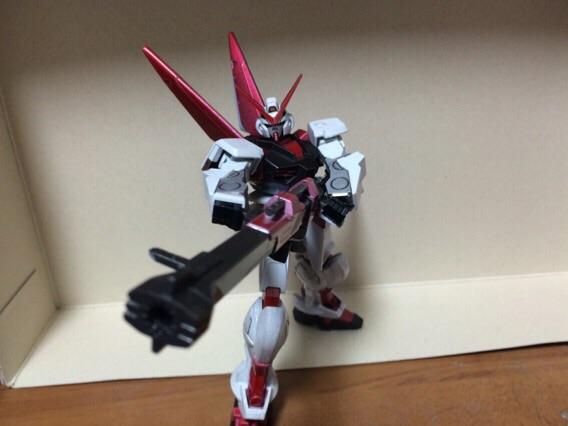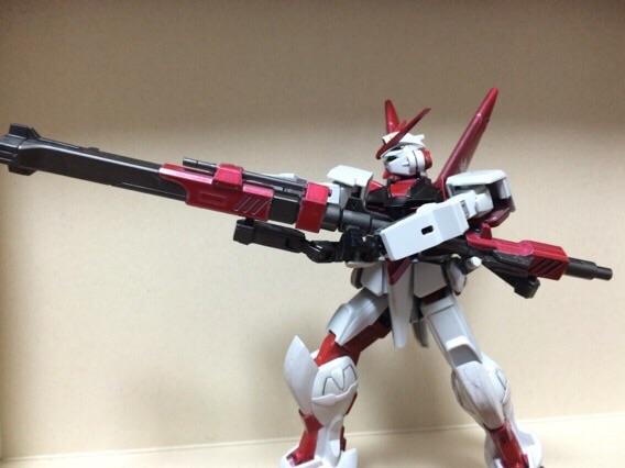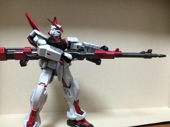 バスターガンダムの腰ユニットが干渉した為、切断してプラ板をはめ込んでアストレイにあわせてあります。