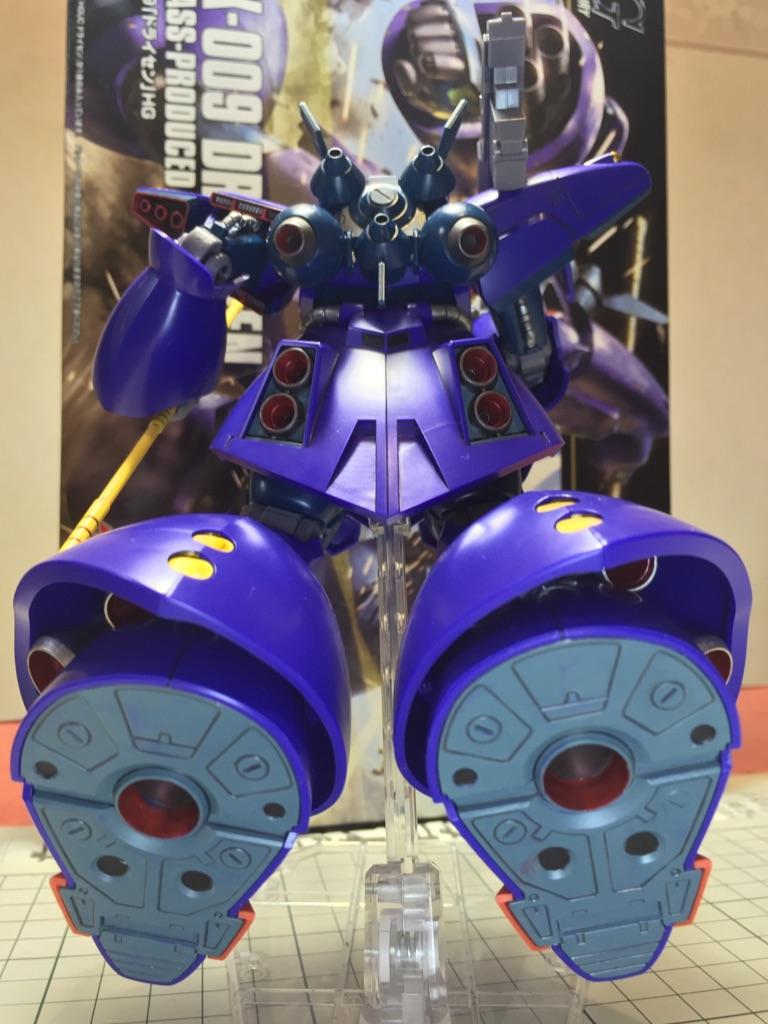 ドライセンはバックパックこそ簡素ですが、スカートや脛装甲、足裏にバーニアが集中しています。