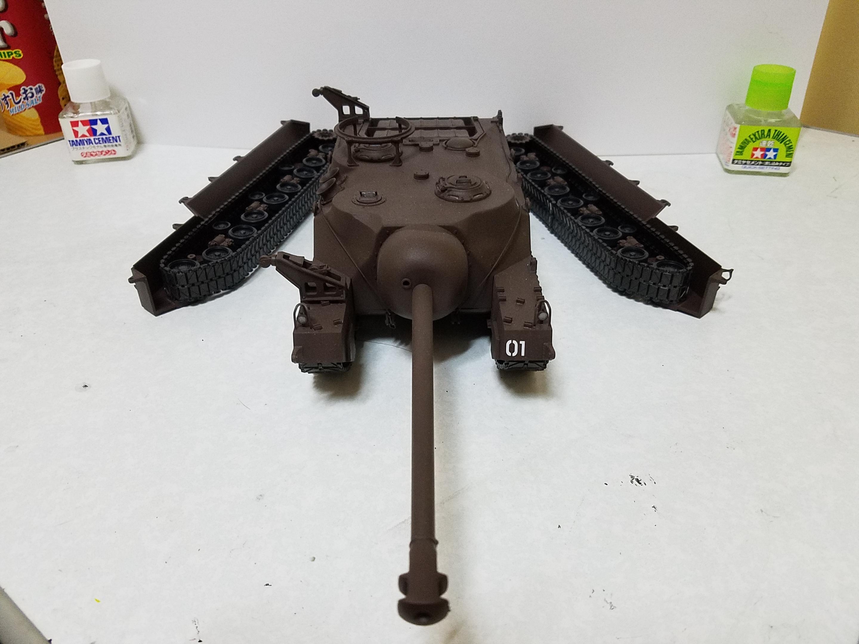 劇場版ガルパンで登場したT28超重戦車です。劇中で行われた外側履帯の分離も出来ます。初の戦車プラモだったのですがとても組みやすく簡単に制作できました。
