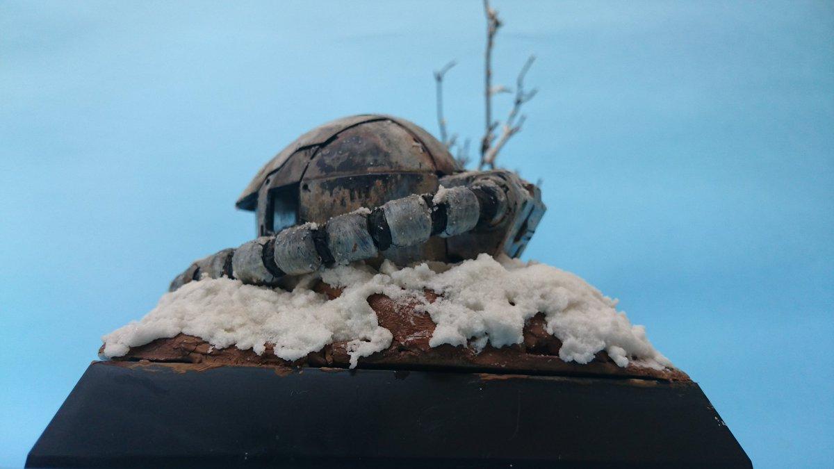 興味深いのは破壊されたザクの頭部に黒い三連星のマーキングが見えるところ。戦力不足に悩む公国軍は三連星のS型ないしC型を地上へ送り現地で地上用のチューン及び冬季迷彩を施したものと思われる。